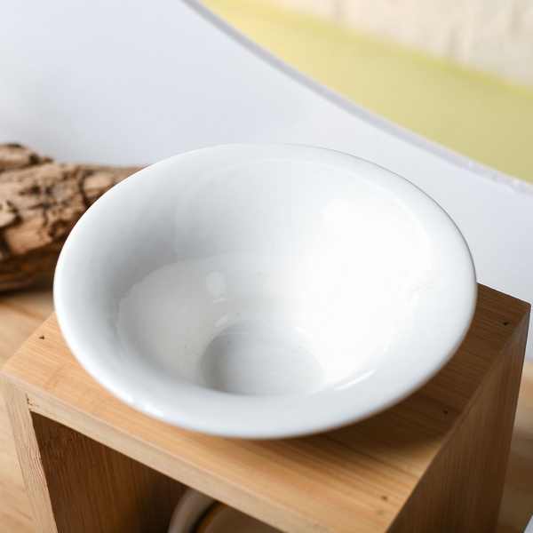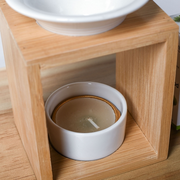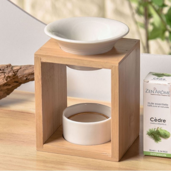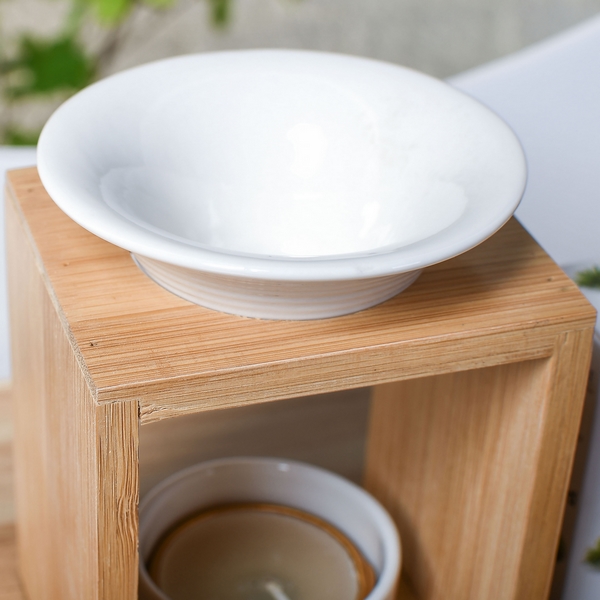 Sa coupelle d’une contenance de 55 ml est parfaitement adaptée pour vos cires ou fondants parfumés, senteurs, huiles essentielles ou autres solutions parfumées, de plus elle est amovible et peut donc se nettoyer facilement. La structure en bambou apporte beaucoup de cachet à l’ensemble tandis que le support en céramique accueille une bougie chauffe-plat en toute discrétion (bougie non fournie).