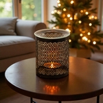Tout en métal au motif découpé au laser, ce brule parfum élégant trouvera sa place dans votre intérieur. L'arbre de vie, symbole emblématique de spiritualité, ses ouvertures permettent à la douce lueur de la bougie de s'échapper et d'apporter une ambiance tamisée et délicieusement parfumée à vos soirées.