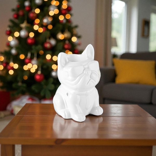Découvrez le nouveau modèle de notre gamme de brûle-parfum série Céramy. Entièrement fabriqué en céramique avec une finition blanc brillant, ce brûle-parfum est inspiré par l'un des compagnons les plus fidèles : le chien. Vêtu d'un élégant costume blanc et portant des lunettes de soleil, il représente un bouledogue affectueux, espiègle et joueur.
