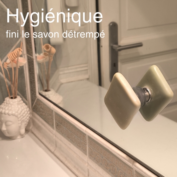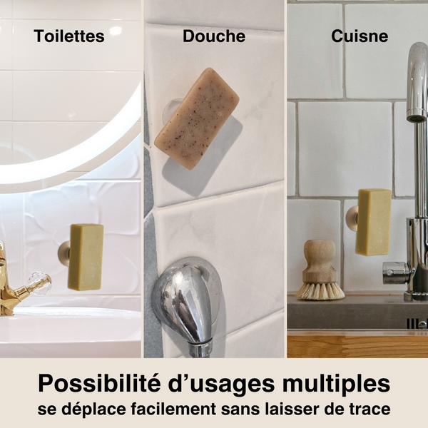 Hygiénique, pratique et au design discret pour les toilettes, la salle de bain comme pour la cuisine. Sa ventouse puissante permet une fixation express, sans outil. Votre savon reste ainsi toujours au sec et dure plus longtemps.